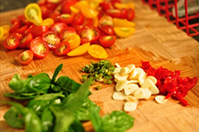- Để chuẩn bị cho phần rau củ, mình rửa sạch cà chua bi rồi cắt làm hai, bỏ cuống ớt rồi thái sợi ra, bóc vỏ tỏi rồi xắt lát mỏng, rửa sạch và nhặt lấy lá rau húng rồi băm nhỏ phần cọng.